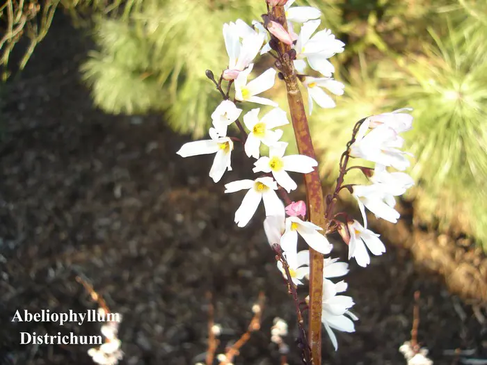 Abeliophyllum distichum afkomstig uit Korea, is een struik met een vrij lage bossige groeiwijze.