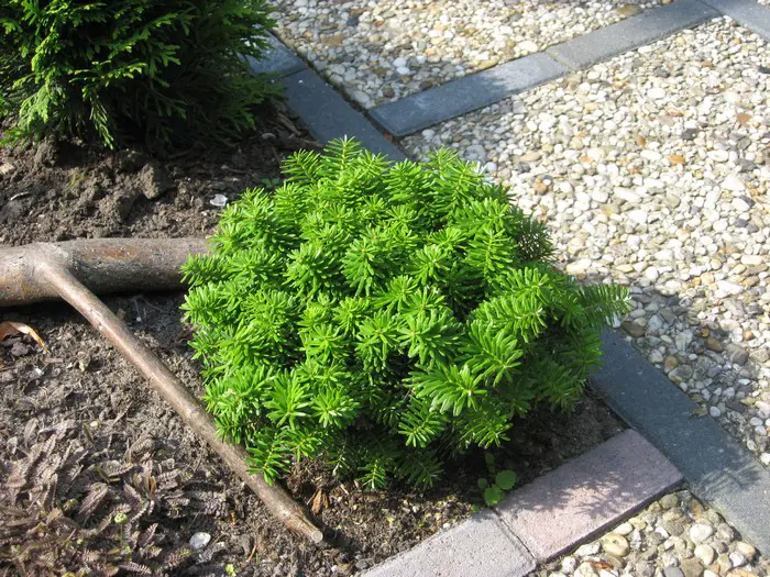 Abies koreana 'Cis' is een traaggroeiende dwergconifeer met een platte bolvorm.