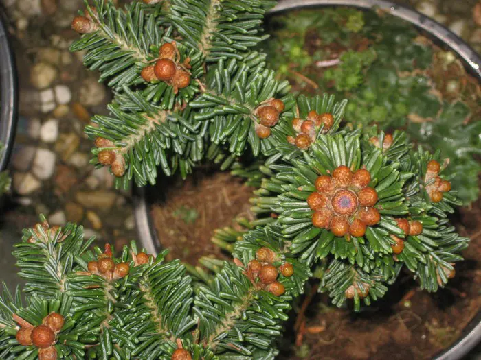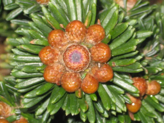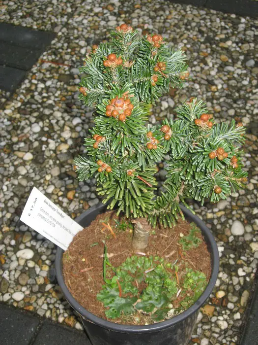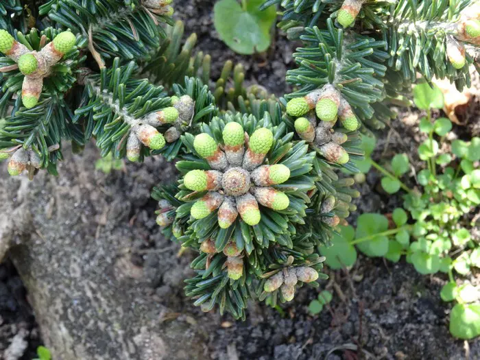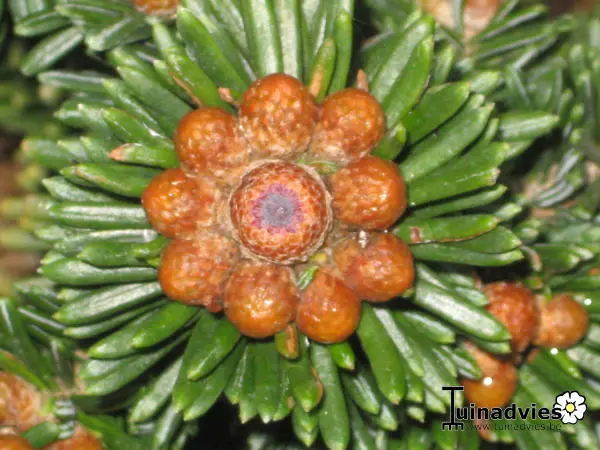 Abies lasiocarpa 'Toenisvorst' is een bolvormige dwergconifeer met vanaf het najaar opvallende dikke eindknoppen.