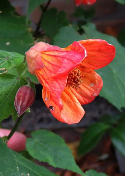 Abutilon 'Tango' is een langbloeiende plant met lantaarnachtige, oranjerode bloemen aan overhangende stengels.