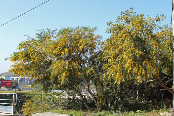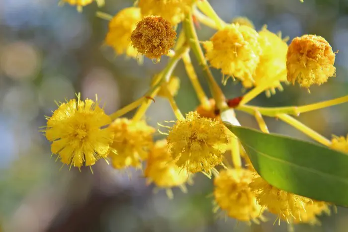 Bloeit met trosjes van fel gele bolvormige bloemhoofdjes.