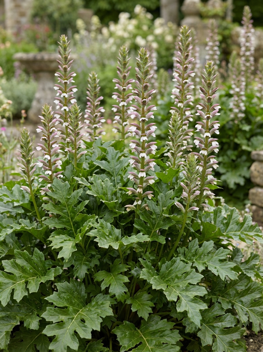 Acanthus hungaricus is een statige vaste plant met een grote sierwaarde die structuur geeft in de tuin met zijn grote bladeren en aarvormige bloemen.