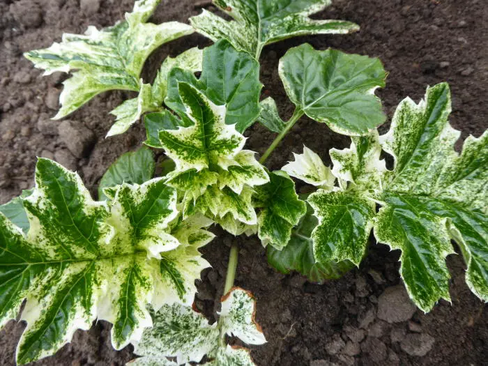 Deze variëteit is wel een héél originele met zijn witte bloemen en rozewitte schutbladeren! prachtig bij de sterk ingesneden donkergroene bladeren, bespat met cremewitte vlekken.