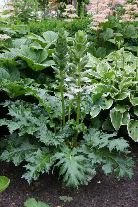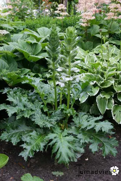 Acanthus mollis is een statige vaste plant met een grote sierwaarde die structuur geeft in de tuin met zijn grote bladeren en aarvormige bloemen.