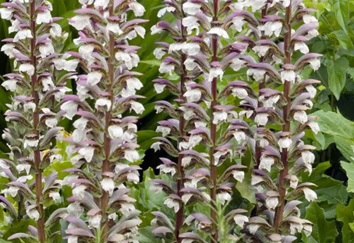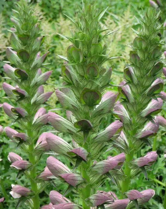 In de zomer bloeien de hoge aren met rozewitte bloemen en stekelige, paarse schutbladeren, na de bloei blijven ze nog tot in het najaar decoratief.