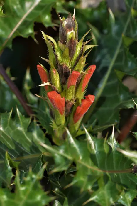 Vormt donkere stengels met stekelige, distelachtige zilvergroene bladeren.