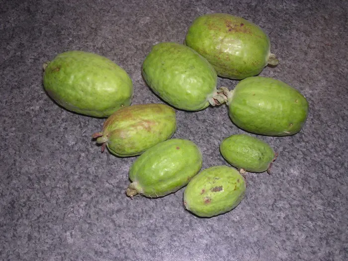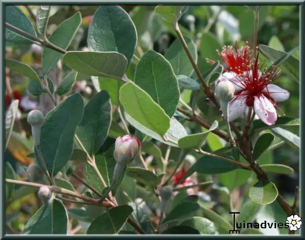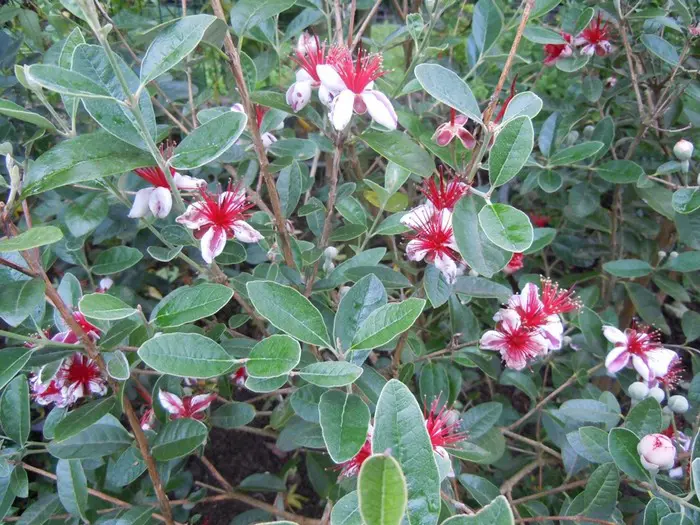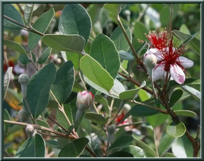 Acca sellowiane is een middelgrote groenblijvende heester en bloeit met geurende witroze bloemen waarvan de opvallende lange meeldraden rood zijn, gevolgd door eetbare groenrode vruchten met een zoetzure ananassmaak