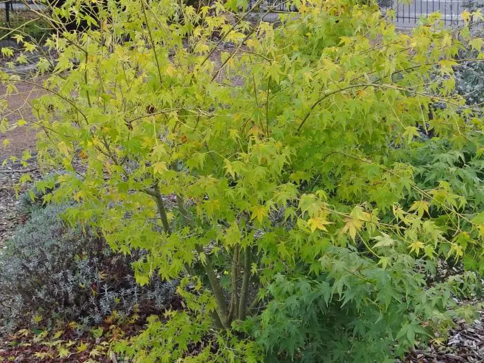 Acer palmatum 'Aoyagi' is een opgaande, bladverliezende struik of kleine boom met frisgroene bast en handvormige, heldergroene bladeren die geel worden in de herfst.