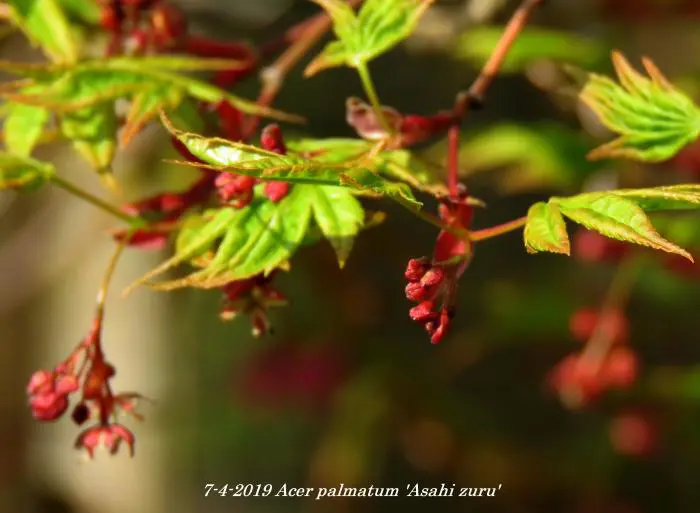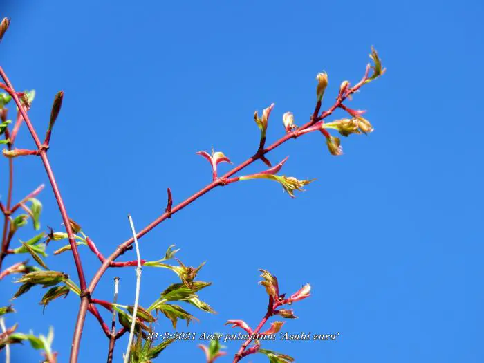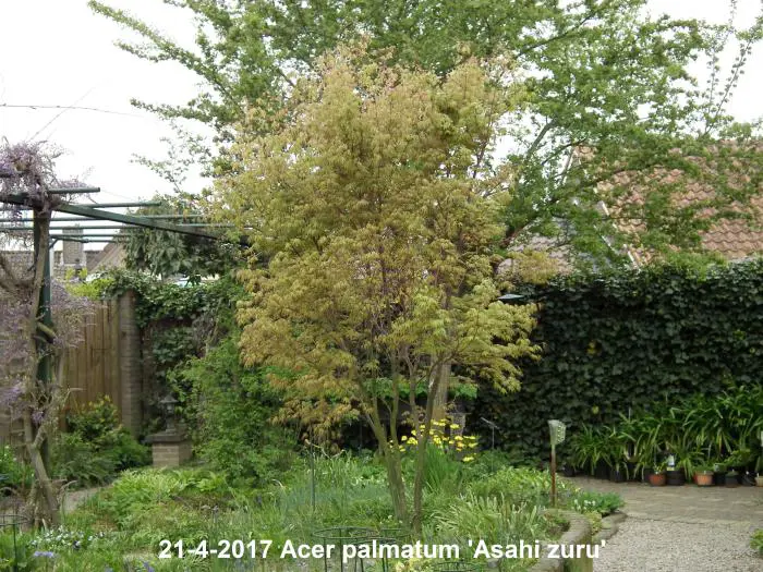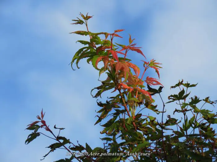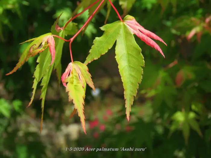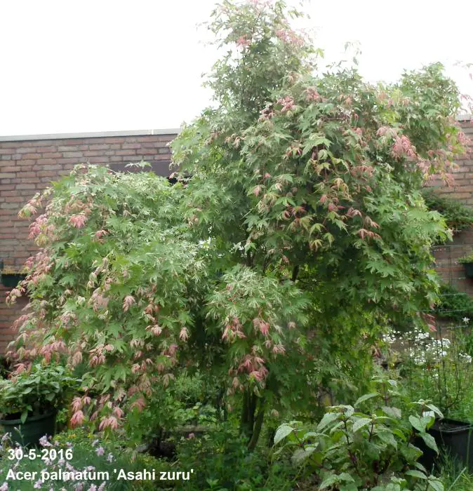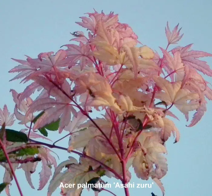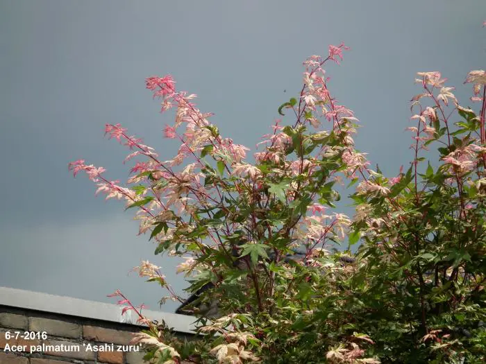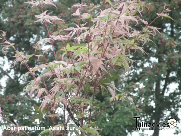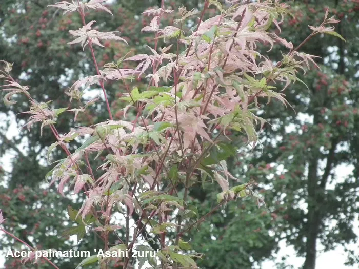 Acer palmatum 'Asahi zuru' is een langzaam groeiende ronde struik/boom met gelobde wit/roze gevlekte, groene bladeren.