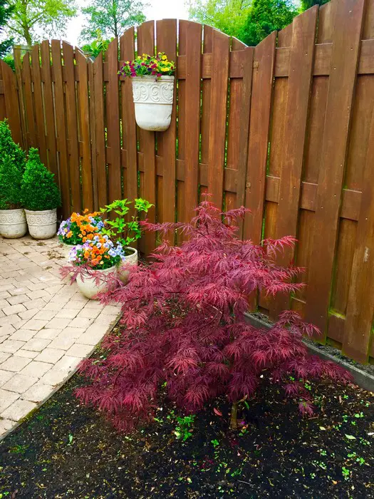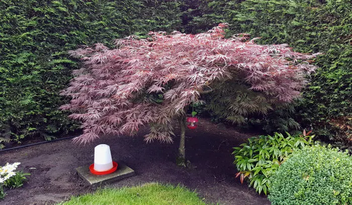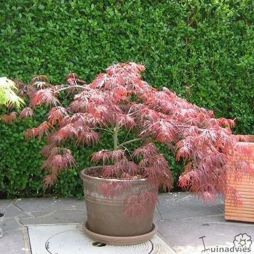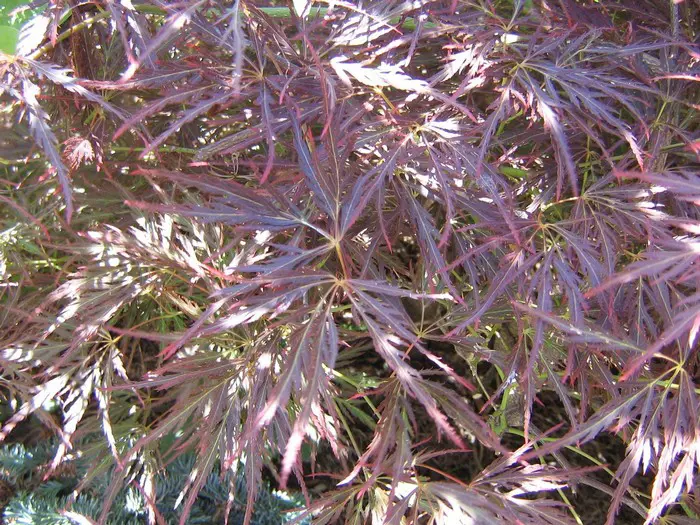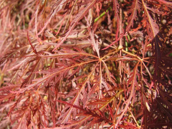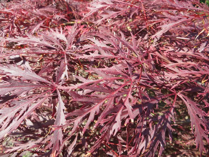 Acer palmatum 'Garnet' is een traag groeiende struik met een mooie sierlijke vorm, geliefd voor zijn schitterende donkerrode bladeren en scharlakenrode herfstkleuren.
