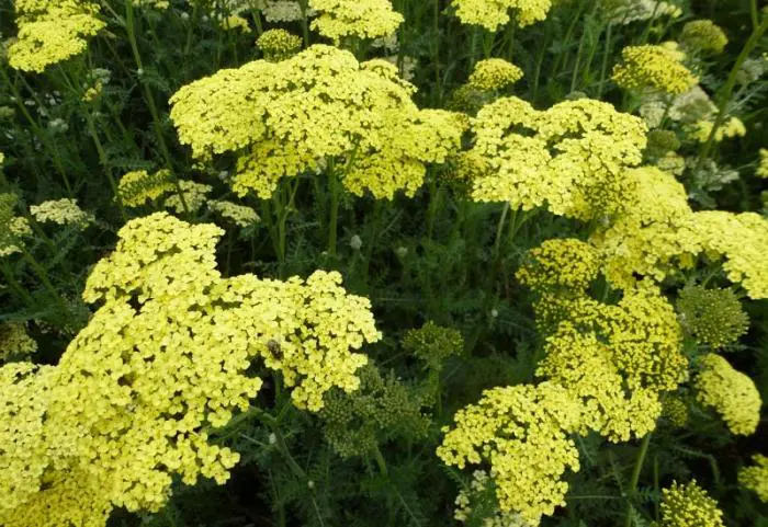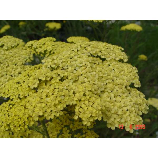 Achillea filipendulina 'Credo' is een snelgroeiende, bodembedekkende plant met fijn gesneden, zilvergrijs behaarde groene bladeren en afgeplatte schermen van zwavelgele bloemen verbloeiend naar cremegeel.