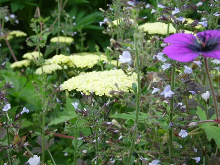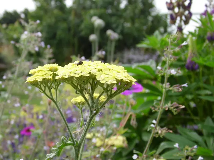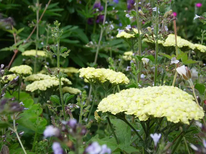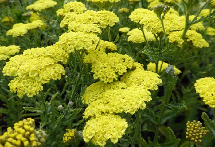 Achillea 'Taygetea' is een rechtopstaande, compacte plant met prachtig, gevederd, zilvergrijs blad en dichte schermen van zwavelgele tot licht citroengele bloemen.