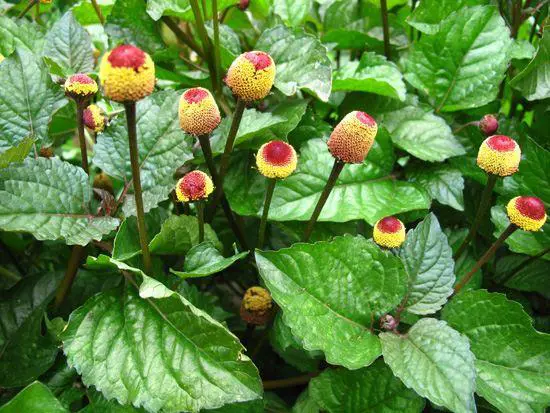 Acmella oleracea is een rijkvertakte plant van donkergroene ovale bladeren en bloeit met bolvormige bloemen van dieprood tot geel bloeiend. Het centrum van de bloem blijft rood.