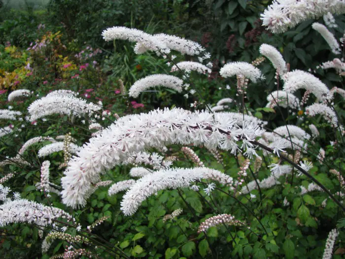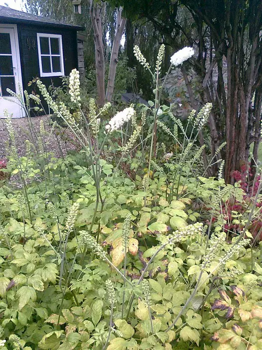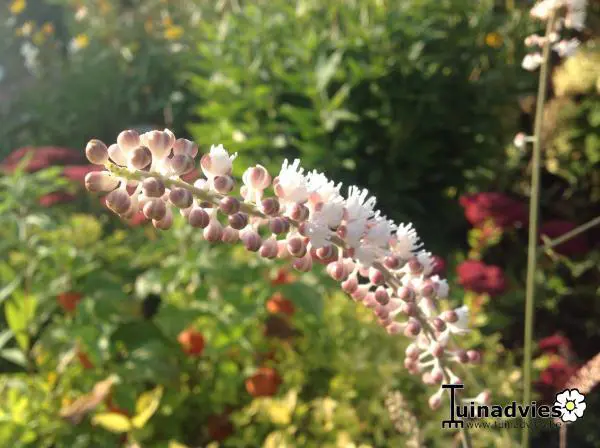 De aarvormige bloemen zijn wit en staan op hoge stelen.