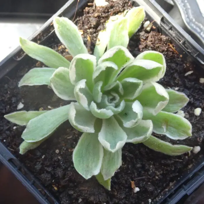 Aeonium 'Ballerina' vormt rozetten van succulente, grijsgroene bladeren, licht behaard met witte randen. Op een zonnige locatie kleuren de bladpunten roze.