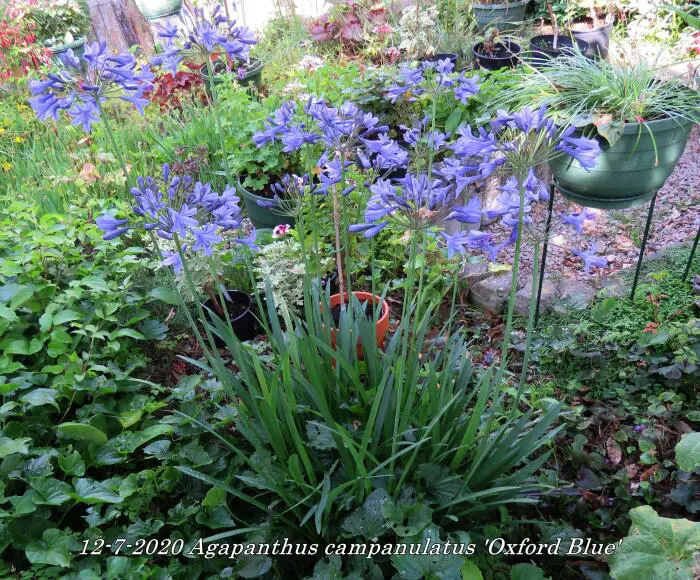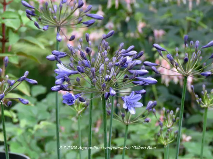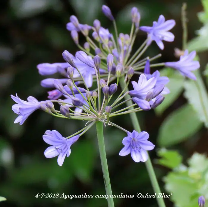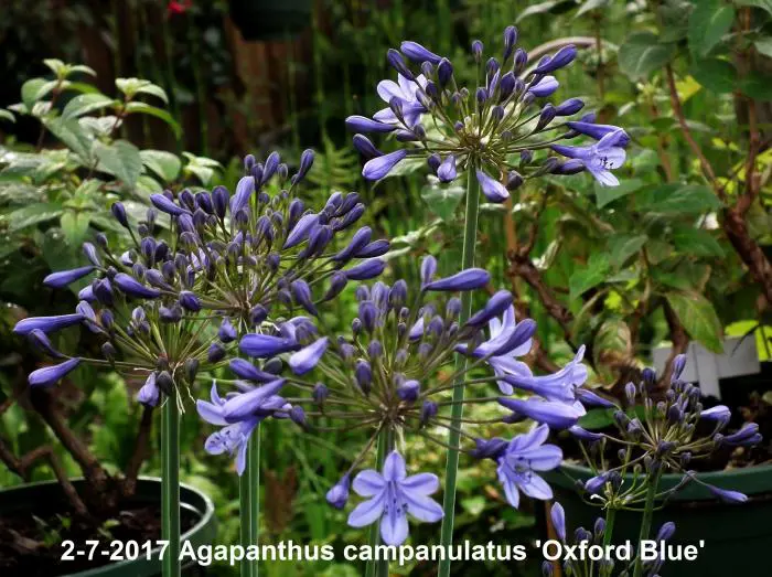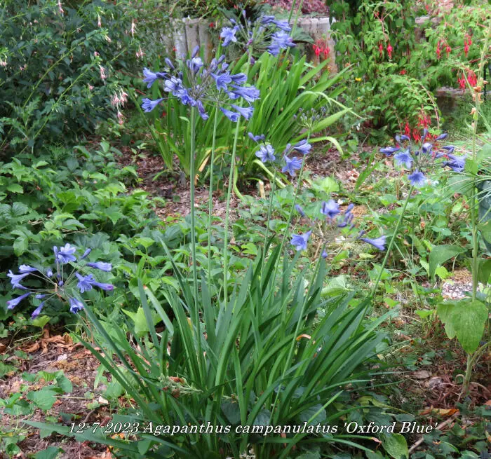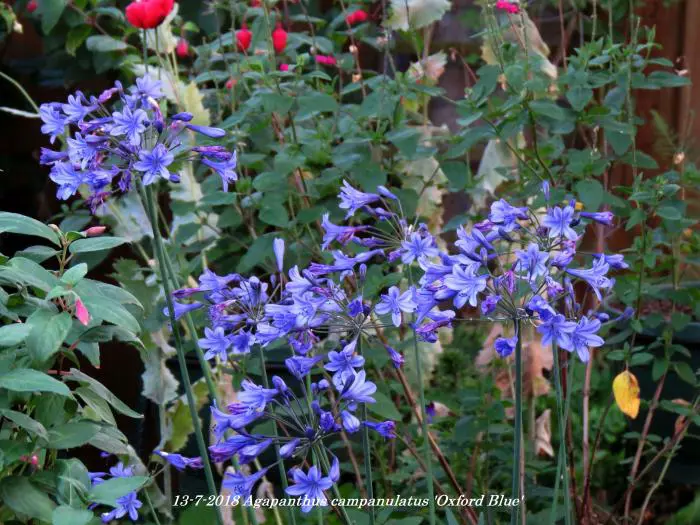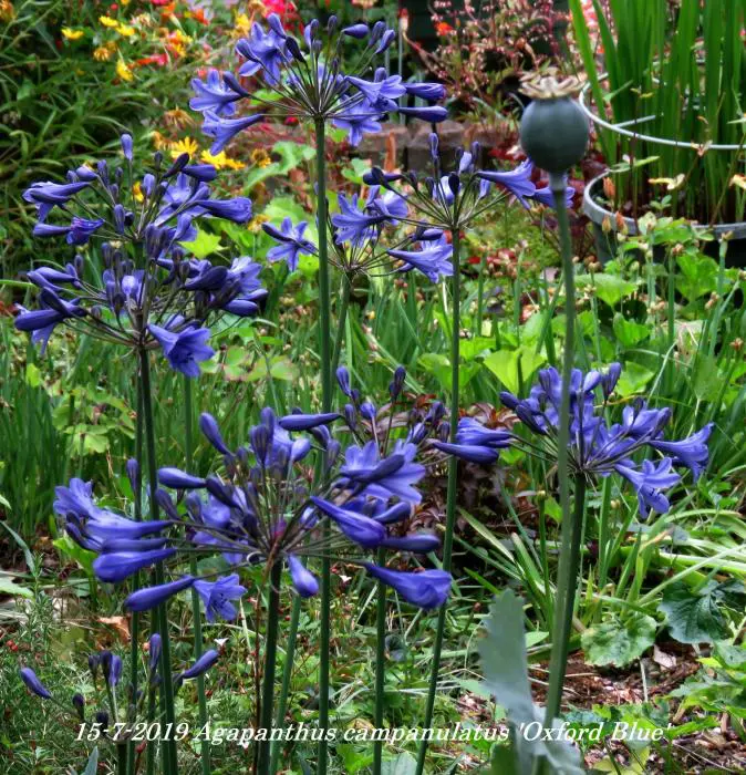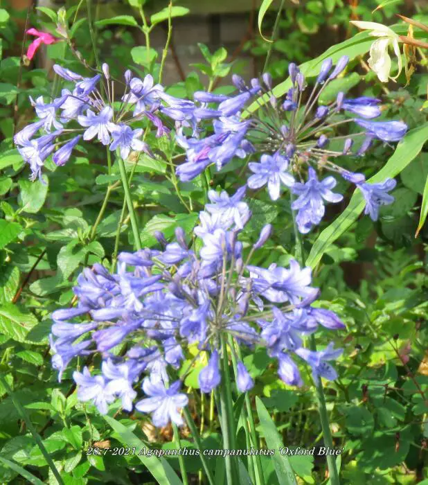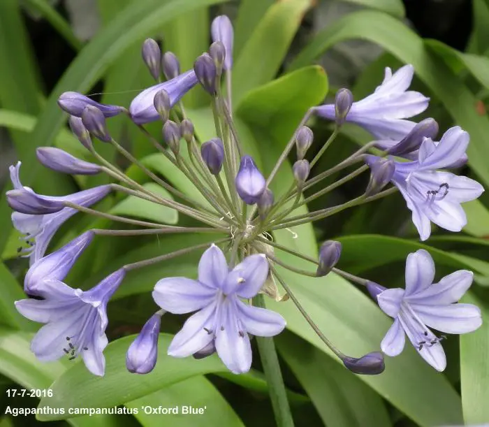 Agapanthus campanulatus 'Oxford Blue' (Salver-groep) uit Zuid-Afrika is een bladverliezende soort met lange grasachtige bladeren;
