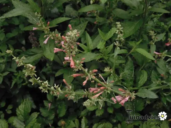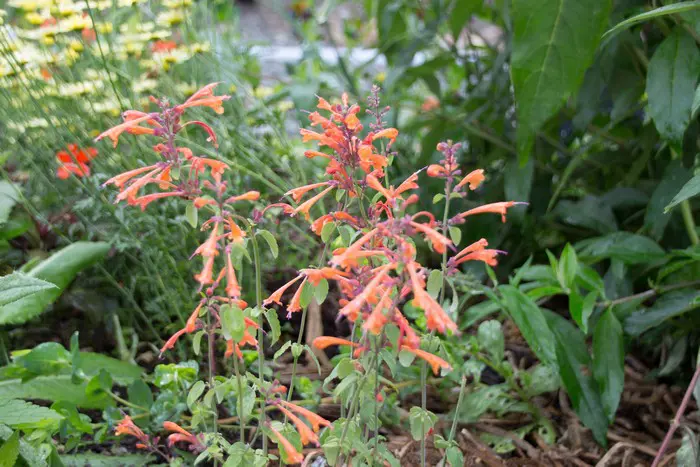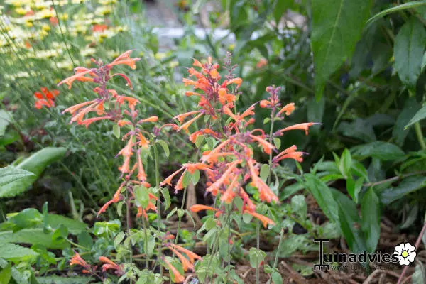 Agastache aurantiaca 'Apricot Sprite' heeft zilvergroene aromatische bladeren en bloeit met abrikoosoranje buisvormige bloemen.