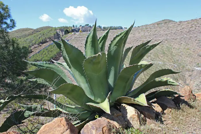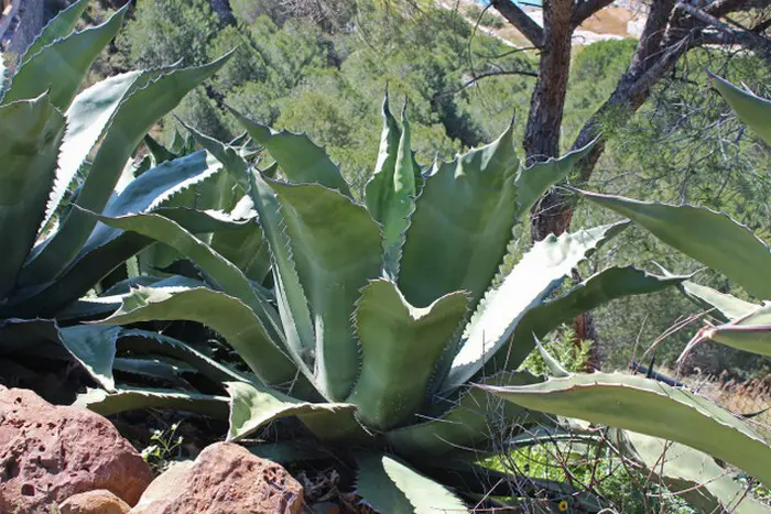Agave salmiana var. ferox vormt een rozet van lange brede overhangende en stekelige bladeren.