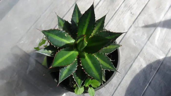 Agave univittata 'Splendida' is afkomstig uit het zuiden van Texas en vormt een rozet van dikke groene bladeren met in het midden van het blad een brede groengele band, witte scherpe tanden langs de randen en korte stekels aan de punt.