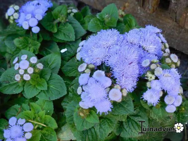 Ageratum houstonianum 'Blue Mink' bloeit met vrolijke pluizige bloemen.