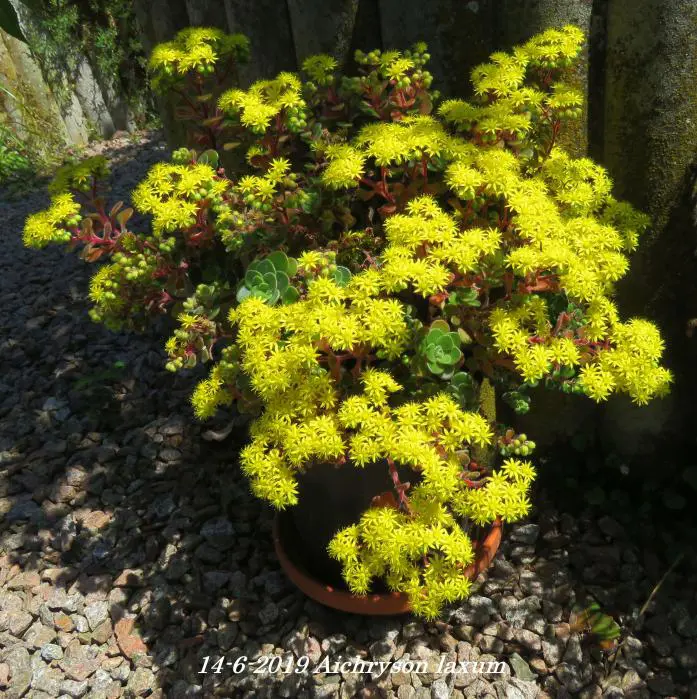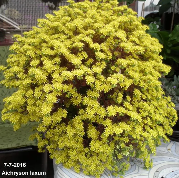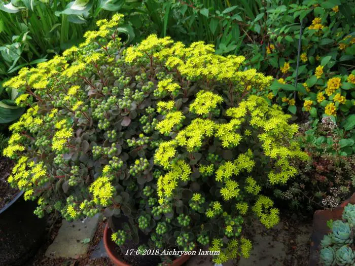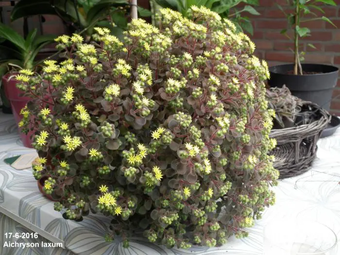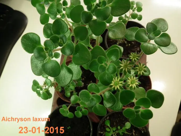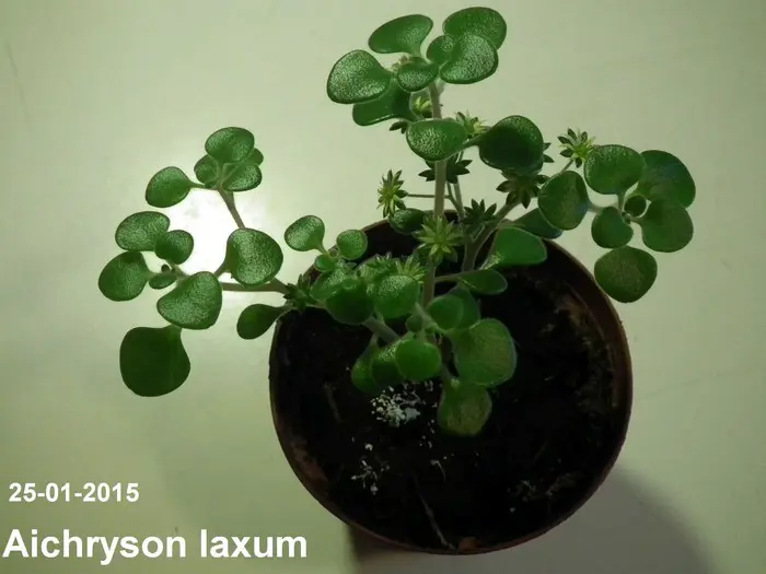 Aichryson laxum inheems op de Canarische Eilanden is een kamerplantje met behaarde blaadjes en stengels. De stengels zijn kleverig en paarsgroen van kleur. De kleine olijfgroene blaadjes, soms lichtjes rood gekleurd zijn rond en vlezig.