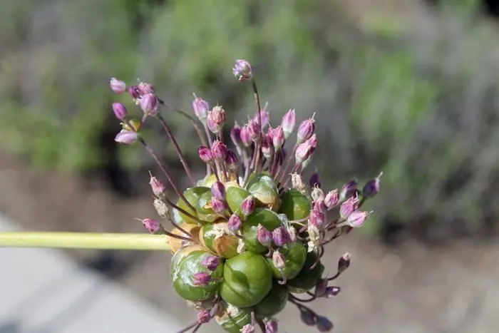 Allium ampeloprasum var. babingtonii bloeit op hoge kale stengels met lilaroze tot paarse bolvormige bloemschermen.