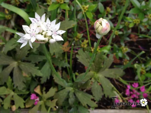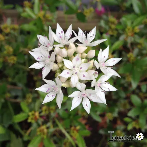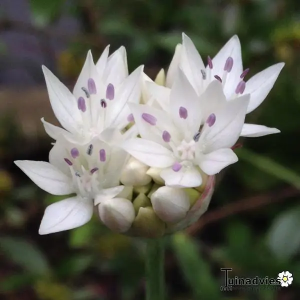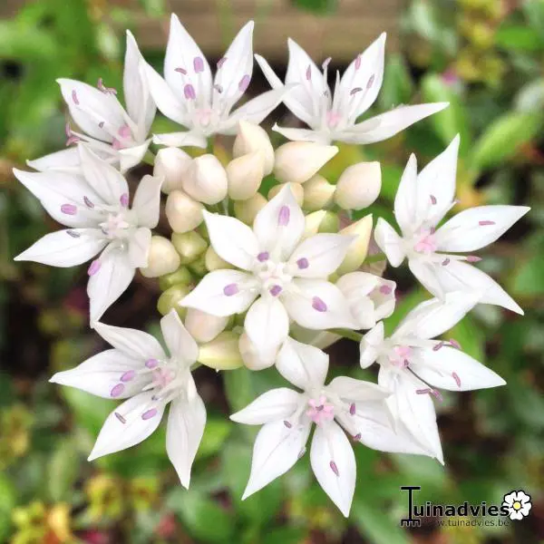 Vormt een bolvormige schermbloem van witte stervormige bloempjes met lavendel meeldraden en paarse helmknoppen.