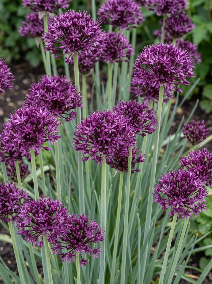 Allium atropurpureum bloeit met grote, zeer donkere, wijnrode bolvormige bloemen op hoge stevige stengels. Na de bloei volgen de mooie zaaddozen die nog lang aantrekkelijk blijven.