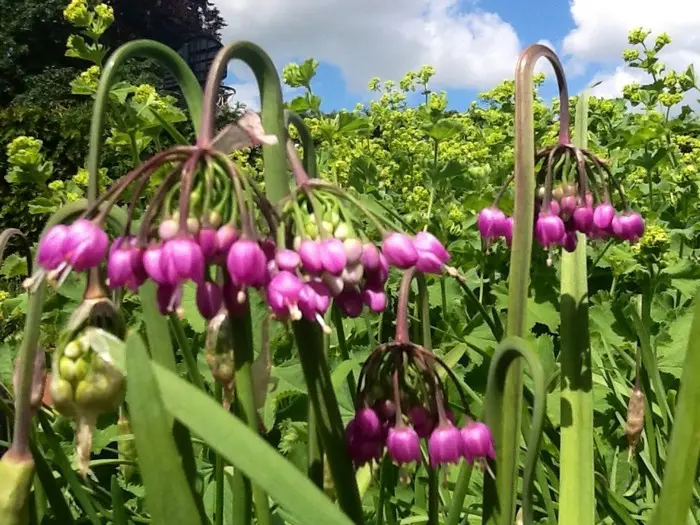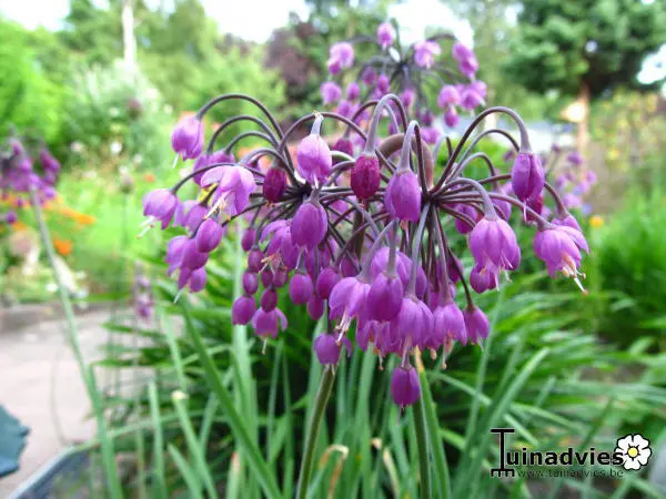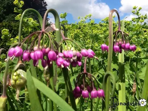 bloeit aan stevige stelen met hangende bloemschermen van lilaroze klokvormige bloemen.