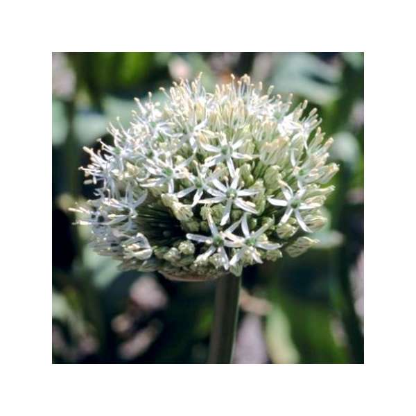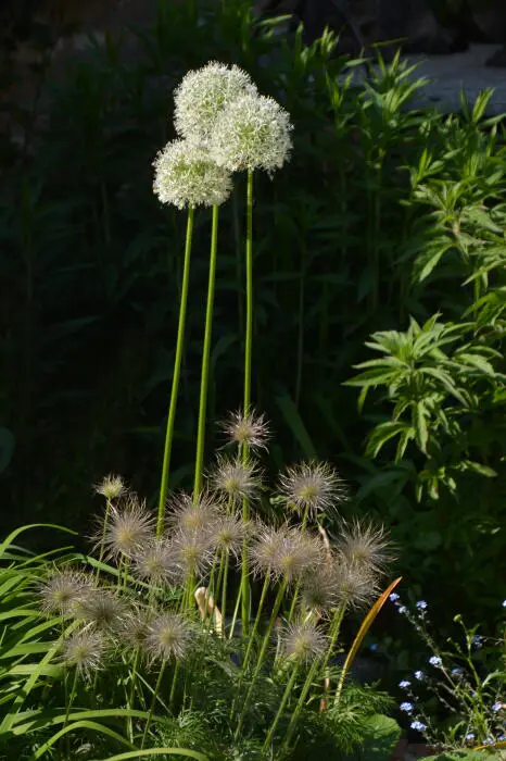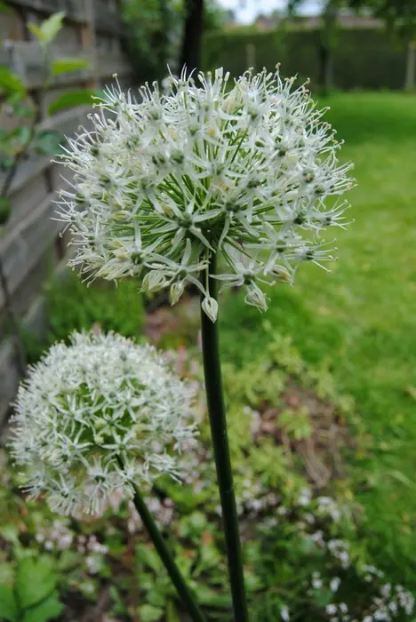 Allium 'Mount Everest' bloeit op hoge rechtopstaande stevige stelen met grote roomwitte bolvormige bloemen samengesteld door kleine stervormige bloempjes.