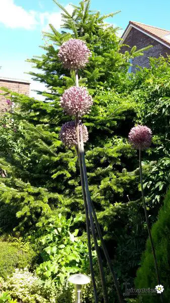 Allium 'Summer Drummer' bloeit met enorme grote lichtpaarse bloemen ø 20cm op lange purperen stengels. Naarmate de bloemen uitbloeien zijn de witte meeldraden duidelijk zichtbaar.