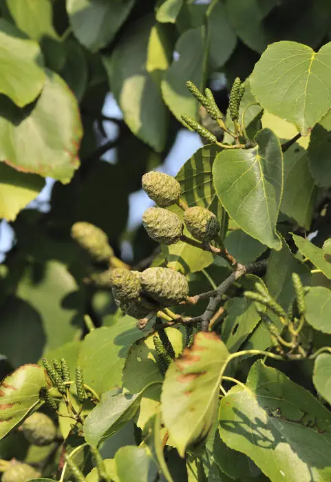 Alnus cordata groeit kegelvormig met een halfopen kroon.