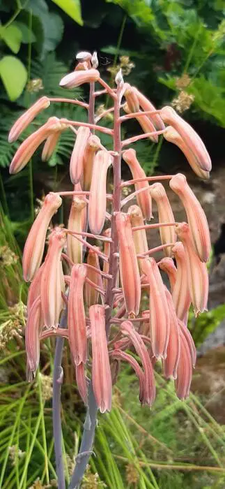 Oranje bloemtrossen aan een lange stengel groeien uit de top van de plant.