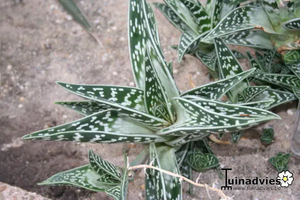 Vormt een rozet van stijve vlezige donkergroene bladeren met witte strepen.