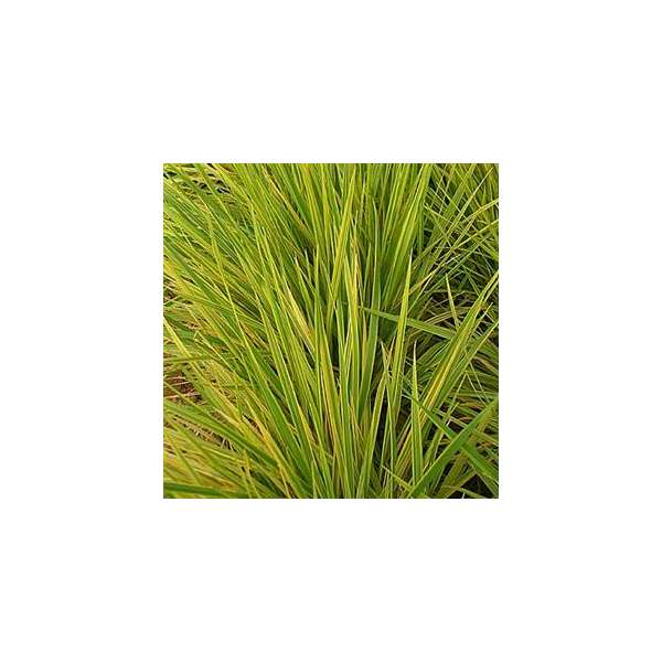 Een beetje wild groeiend siergras in goudgele gepanacheerde bladeren.