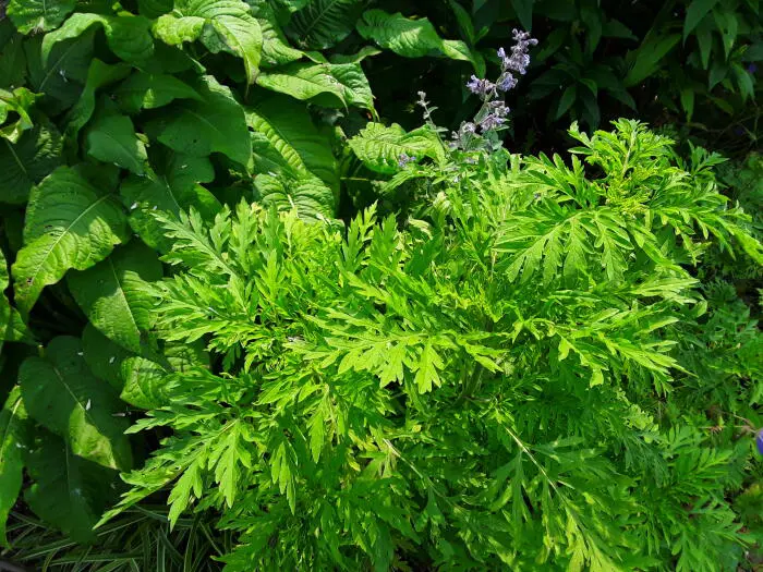 Ambrosia artemisiifolia is een vertakte éénjarige plant met behaarde rode stengels en grote geveerde bladeren.