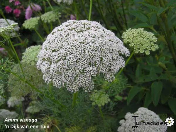 Ammi visnaga groeit forser dan Ammi majus, de bloemscherm is ronder en het blad donkerder groen.