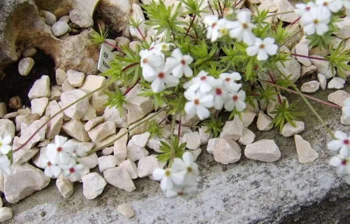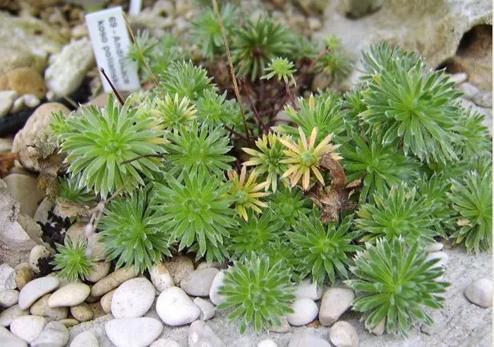Vormt strakke rozetten van wit donzige, groene korte bladeren op rode steeltjes.