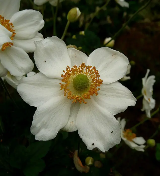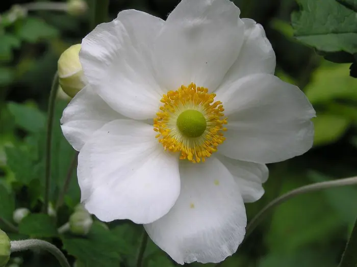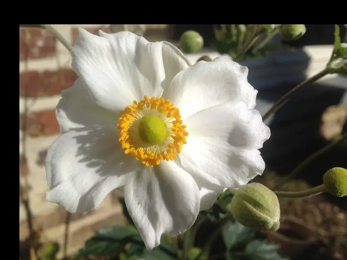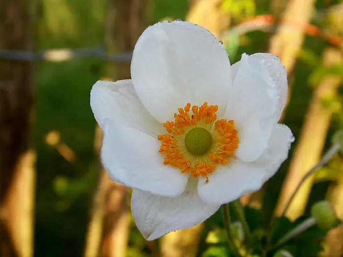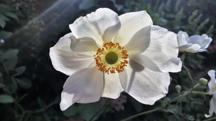 Anemone 'Honorine Jobert' bloeit op hoge stelen met helderwitte enkelvoudige bloemen, iets roziger aan de achterkant en met lange gele meeldraden.