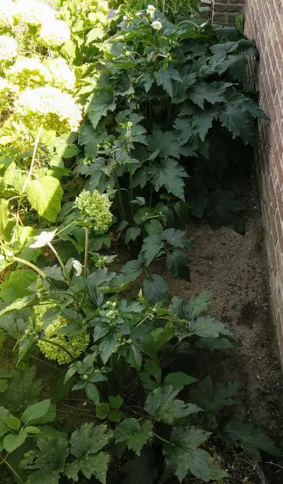 Het donkergroene blad is gelobd, sterk geribbeld aan de onderzijde en min of meer behaard, zeer donzig als het zich ontvouwt in het voorjaar.