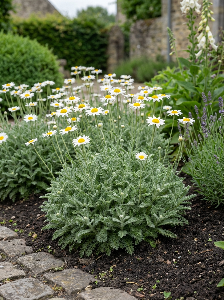 Anthemis carpatica 'Karpatenschnee' is een rotsplant met een kussenvormige groeiwijze.