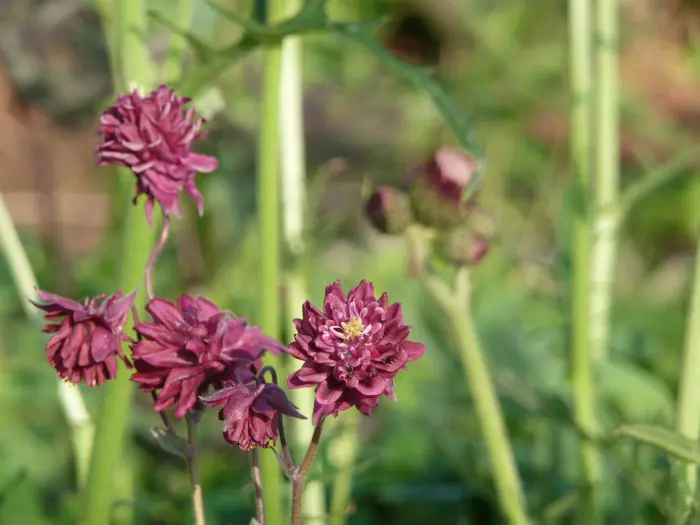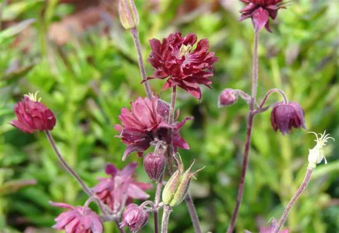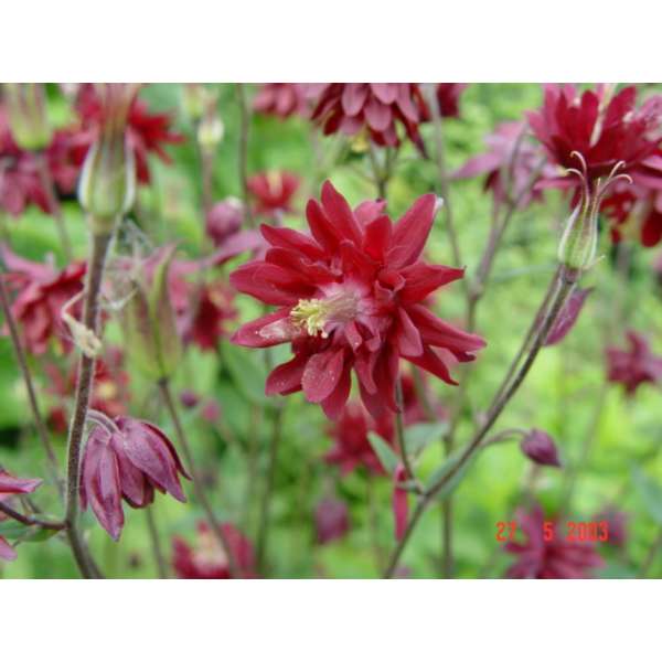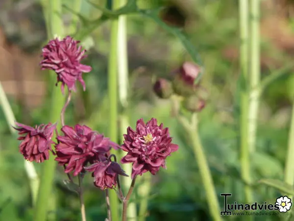 Aquilegia vulgaris 'Ruby Port' is een zeer sierlijke vaste plant met dubbele wijnrode bloemen.