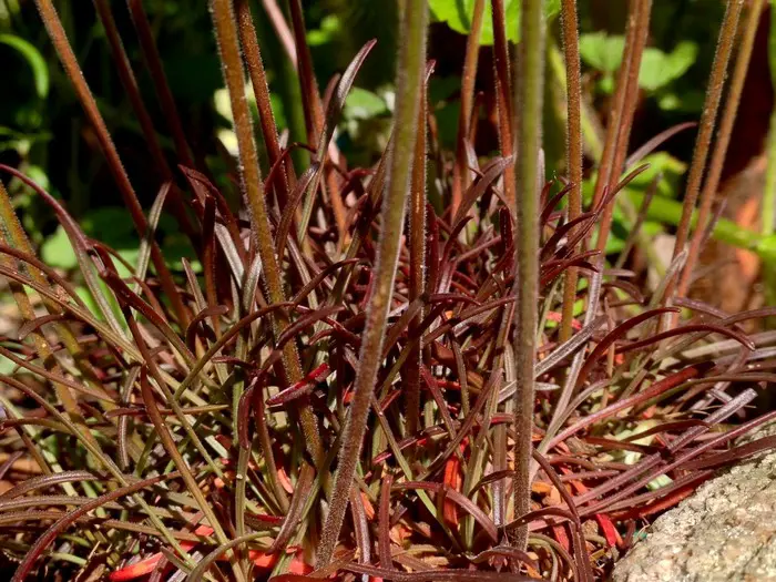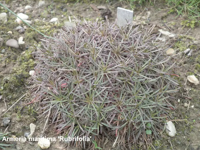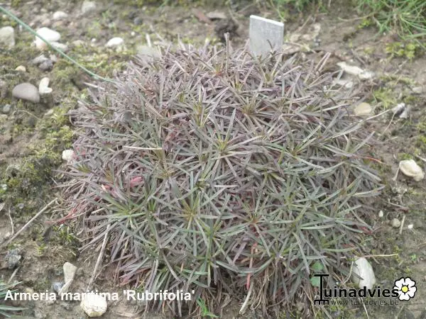 Armeria maritima 'Rubrifolia' vormt grasachtige pollen van zwartpaarse grasachtige bladeren dat in de zomer en herfst naar groen en bronsgroen verkleuren.