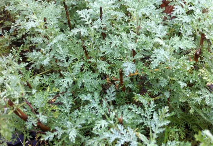 Artemisia abrotanum 'Courson' heeft een recht opgaande en compacte groeiwijze met groene bladeren waarvan de onderkant grijs is.