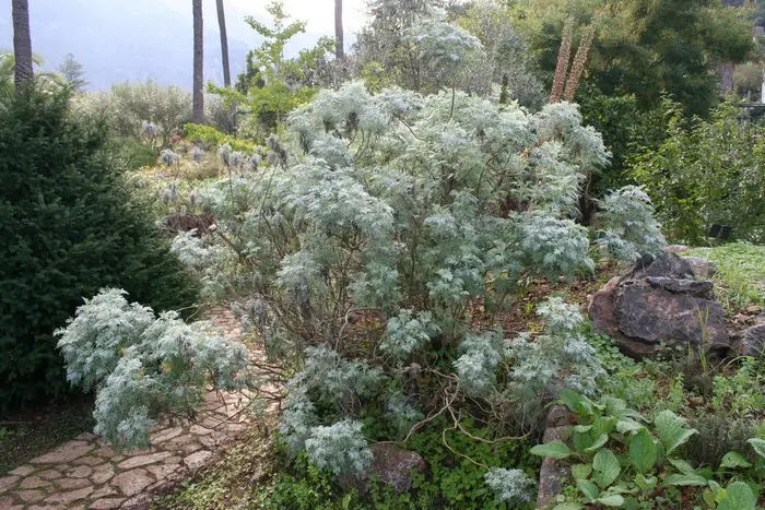 Artemisia arborescens is vooral decoratief door het fijn verdeeld zilverwit blad, bloeit met kleine margrietachtige groengele bloempjes.