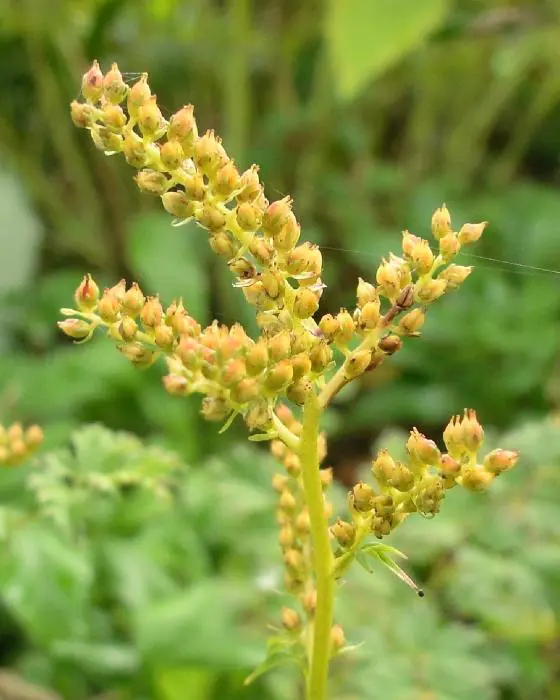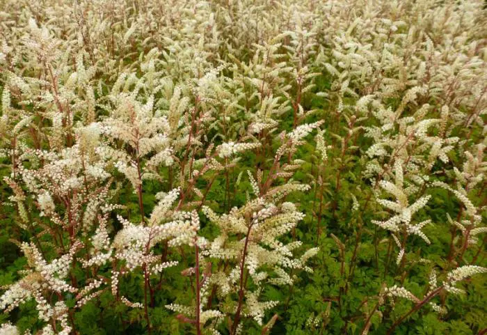 Het varenachtig blad is donkergroen met een bronskleur in het najaar en bloeit met kleinere roomwitte pluimen.