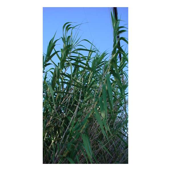 Een hoog riet van 300/400cm met rechtopgaande groei en brede grijsgroene bladeren.