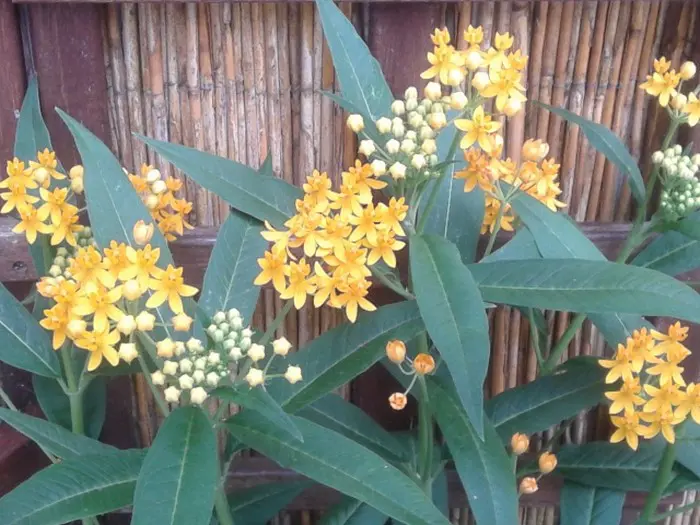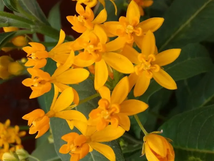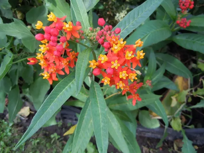 Asclepias curassavica is een halfheester, vaak als eenjarige gekweekt, met rechtopstaande takken en smal lancetvormige donkergroene bladeren.