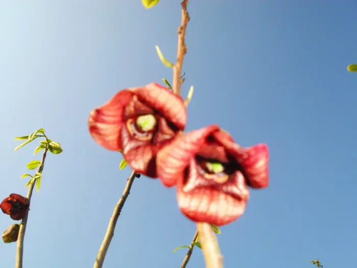 In de lente komen er 'stinkende' wit naar roodbruin verkleurende bloemen aan.