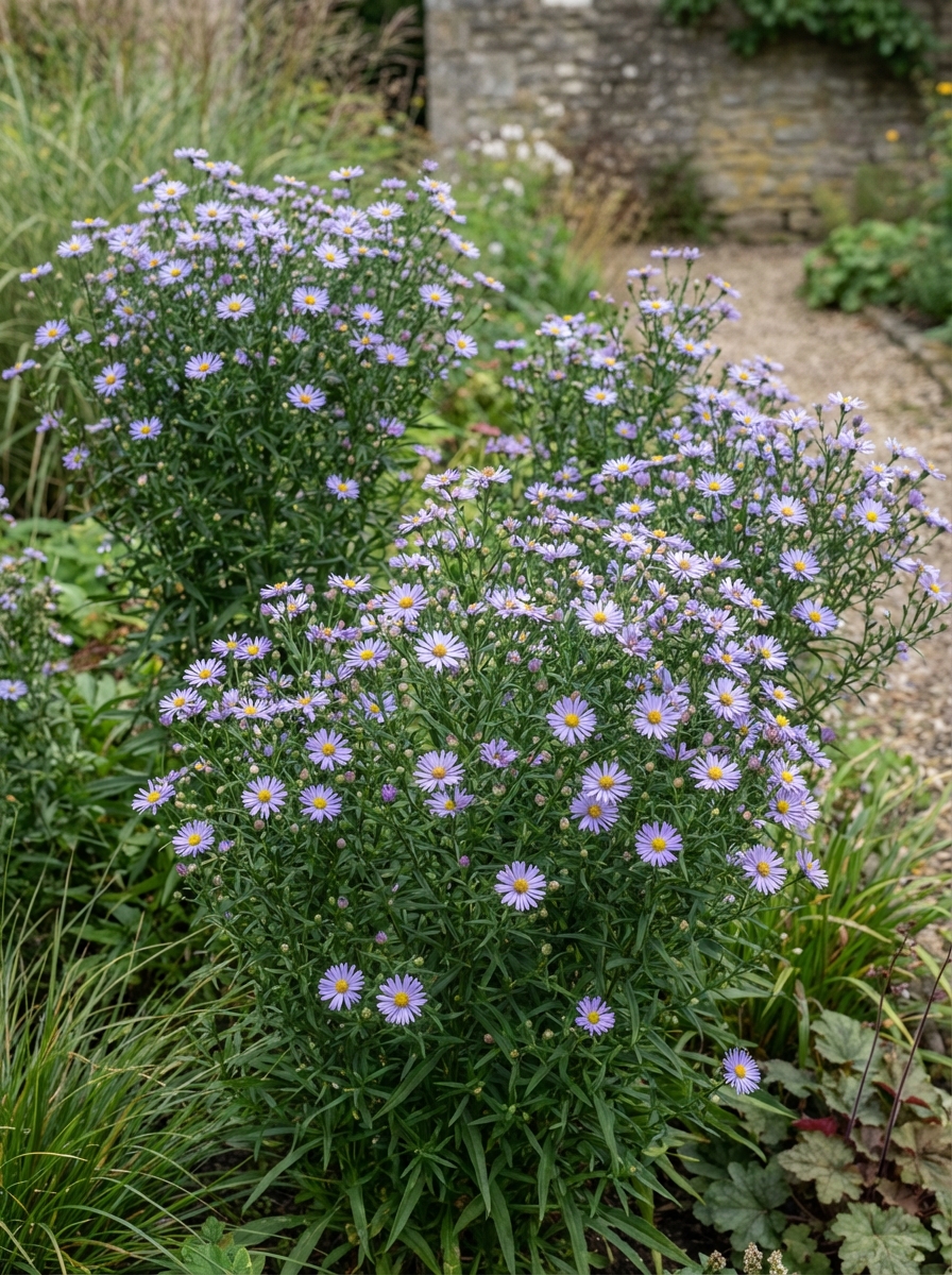 Een kleinbloemige maar zeer rijkbloeiende hoge aster met blauwe bloemen.